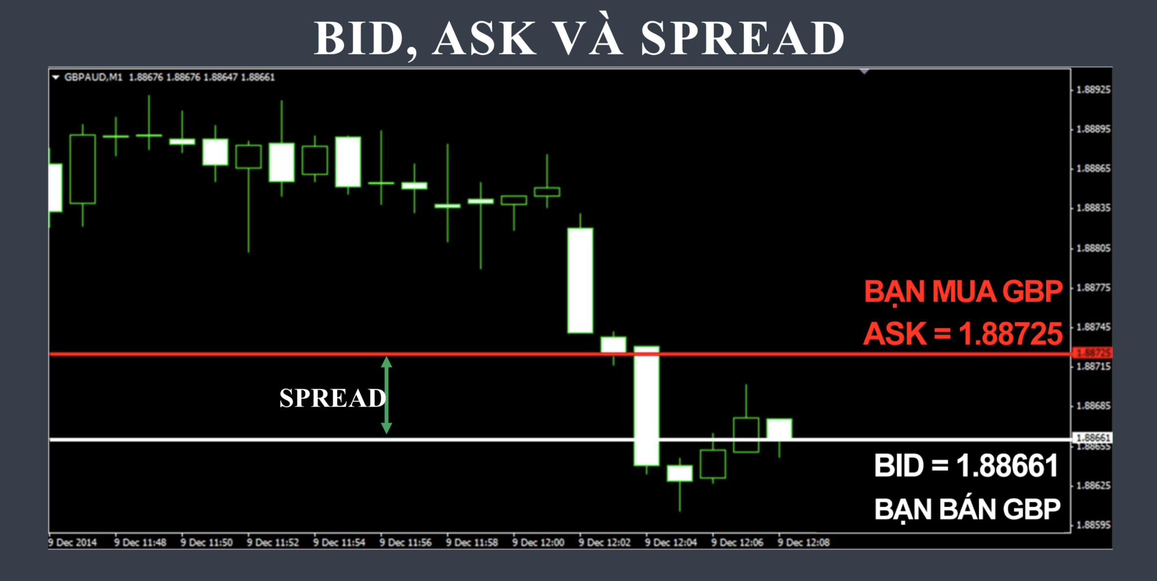 Bid: Giá bán ra. Khi bạn bán ra sẽ bán ở giá Ask